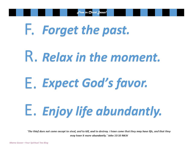 Today, we release all anger, self-doubt, hate, depression and low esteem. We are the righteous of God through Christ Jesus who died that we may be set free. Jesus came that we may have life and have it abundantly. We are Forgetting the Past. We are Relaxing in the Moment. We are Expecting God's Favor. We are Enjoying Life Abundantly! We are F. R. E. E.!